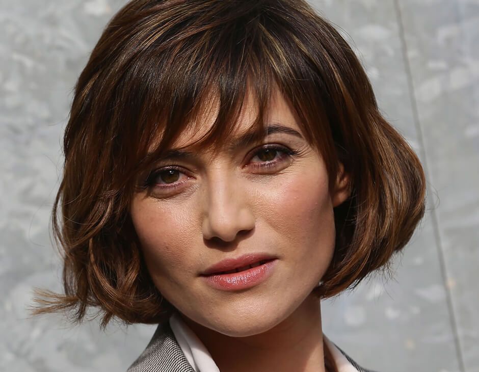 Wavy bob hairstyle with bangs.